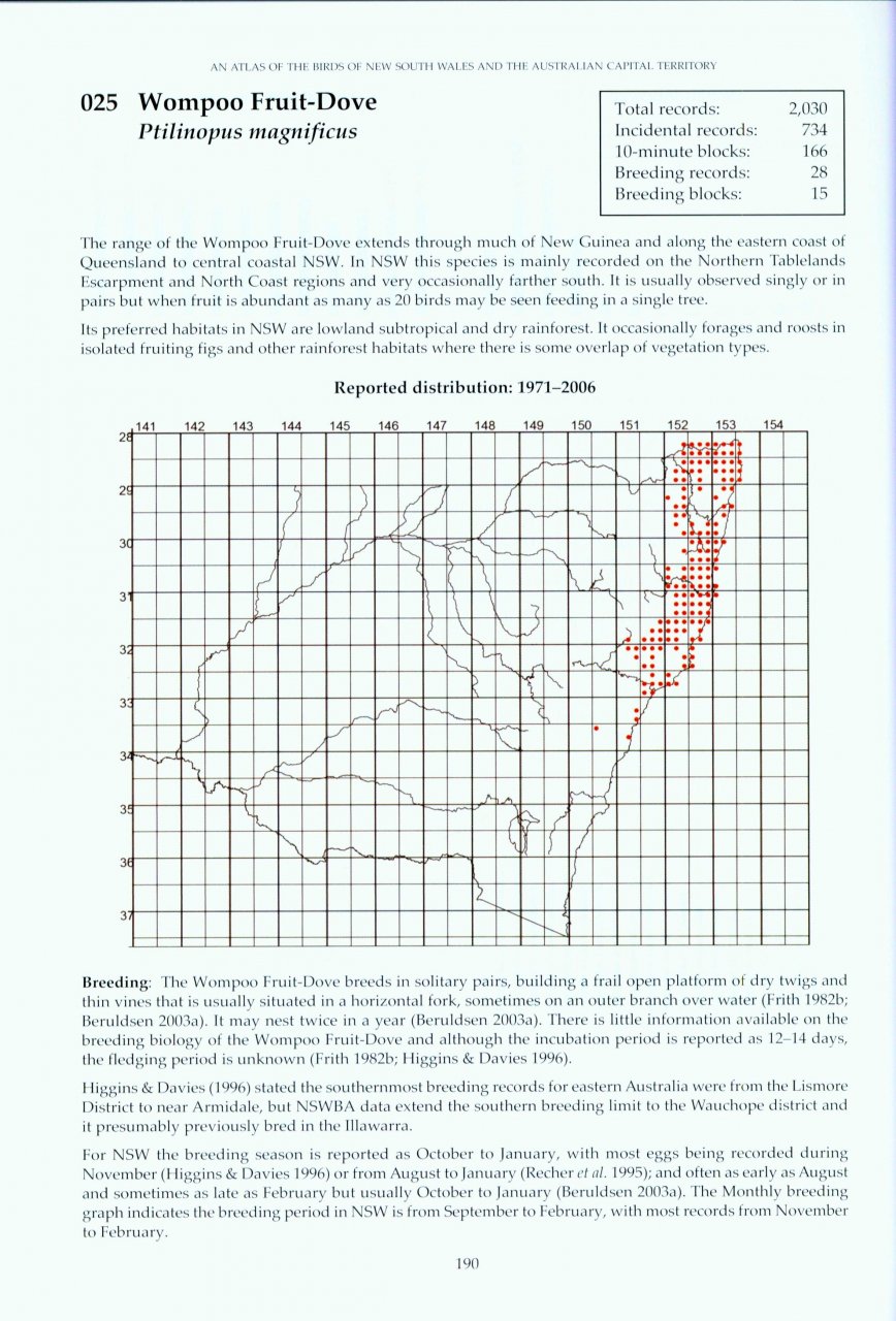 An Atlas of the Birds of NSW & the ACT provides a comprehensive inventory and distributional analysis of the birds of New South Wales, the Australian Capital Territory and the waters of the western Tasman Sea. The New South Wales Bird Atlassers (NSWBA) was formed in late 1981 and its principal aims are to determine the distribution of birds in NSW, monitor their status on a continuing basis and promote better public awareness and understanding of birds. In an exceptional and entirely voluntary expression of concern for the welfare of birds of NSW and the ACT, a great many people willingly and enthusiastically participated in this project, gathering the essential data of many millions of records.