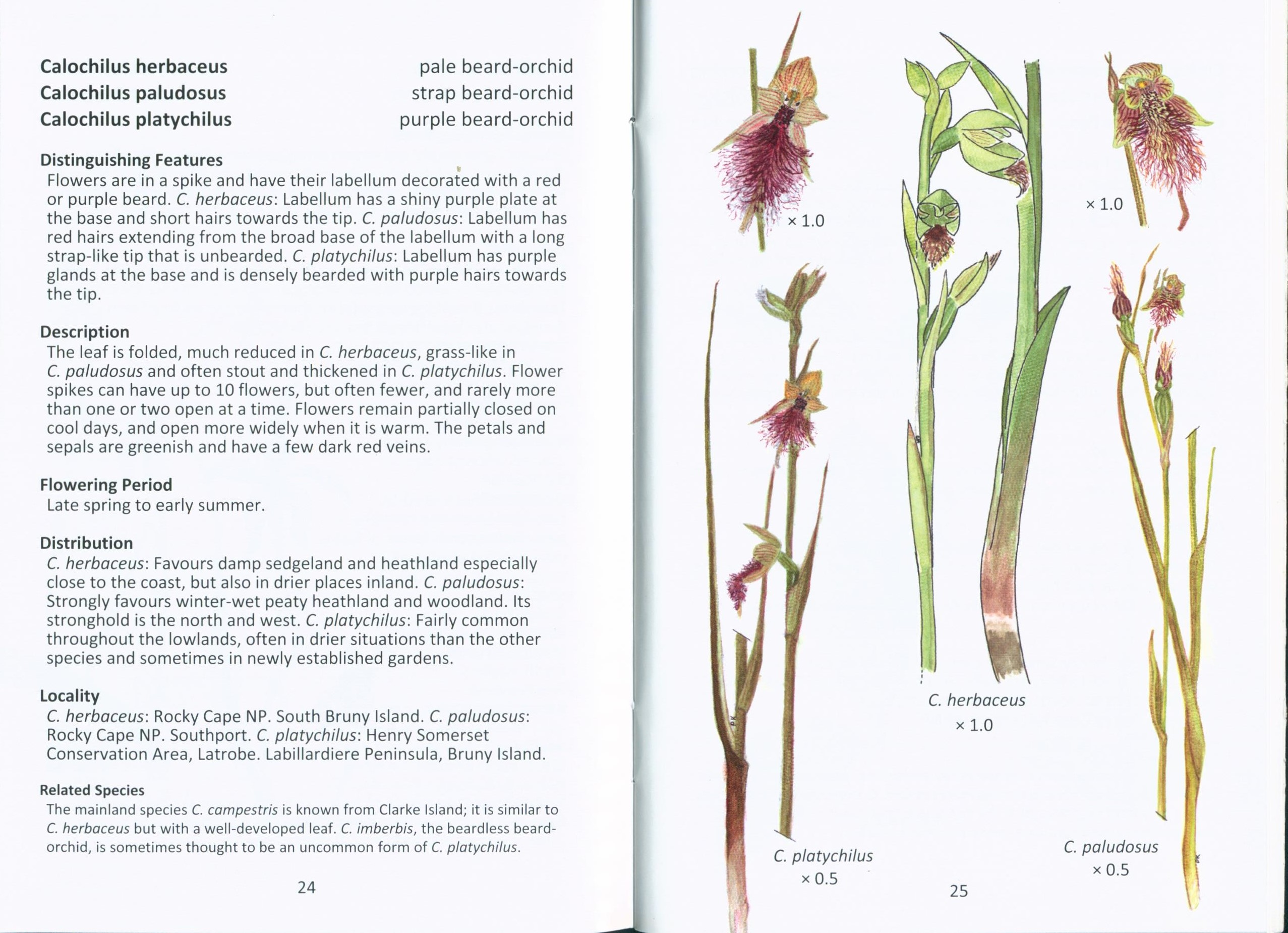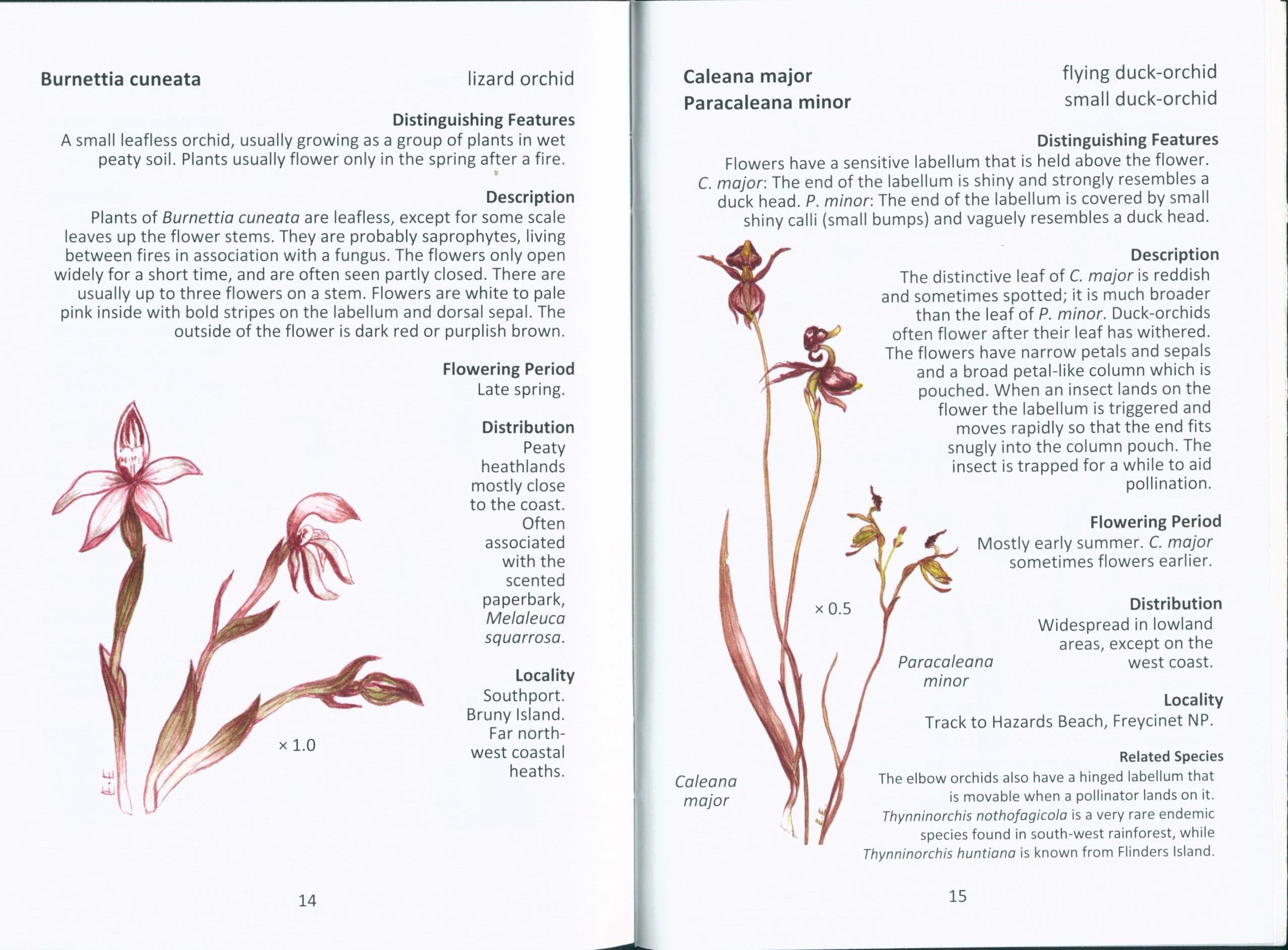 There are more than 200 species of orchids known from Tasmania. This field guide has illustrations and descriptions of most of the common species. This pocket size book is written by APST members, with botanically correct illustrations drawn and hand painted, also by APST members. It also provides the location where they made be found when conditions are right. The majority of Tamania’s orchid species are found in the warmer lowland areas, especially close to the sea. Peak flowering time is generally October and November and a few native species have taken to growing in suburban gardens.