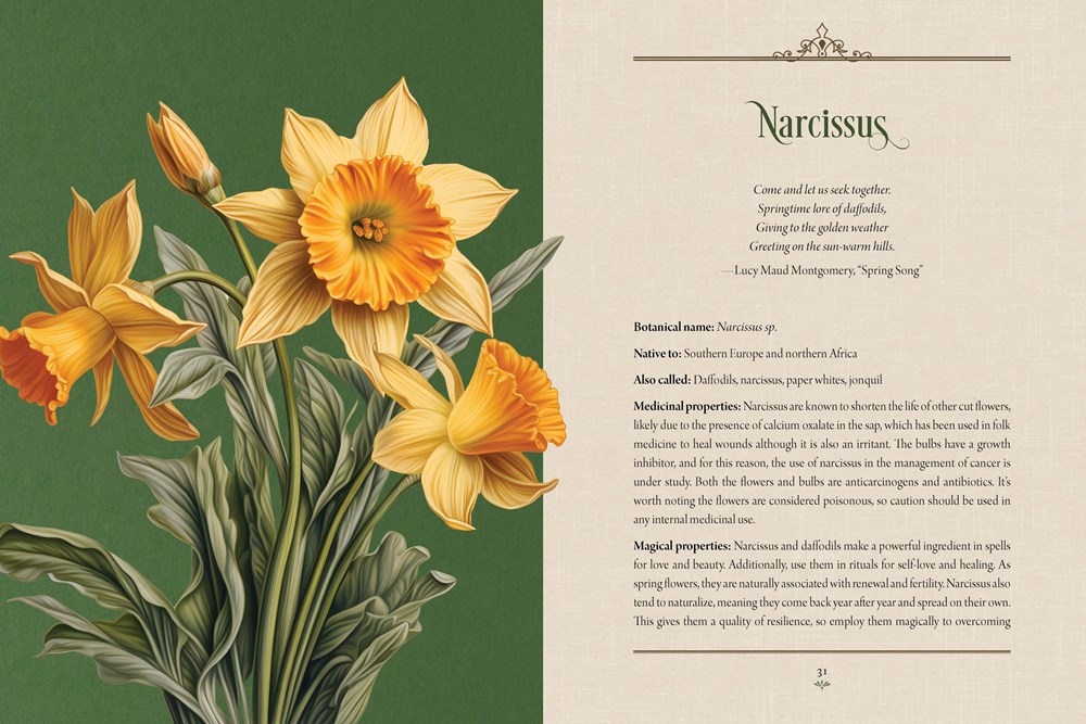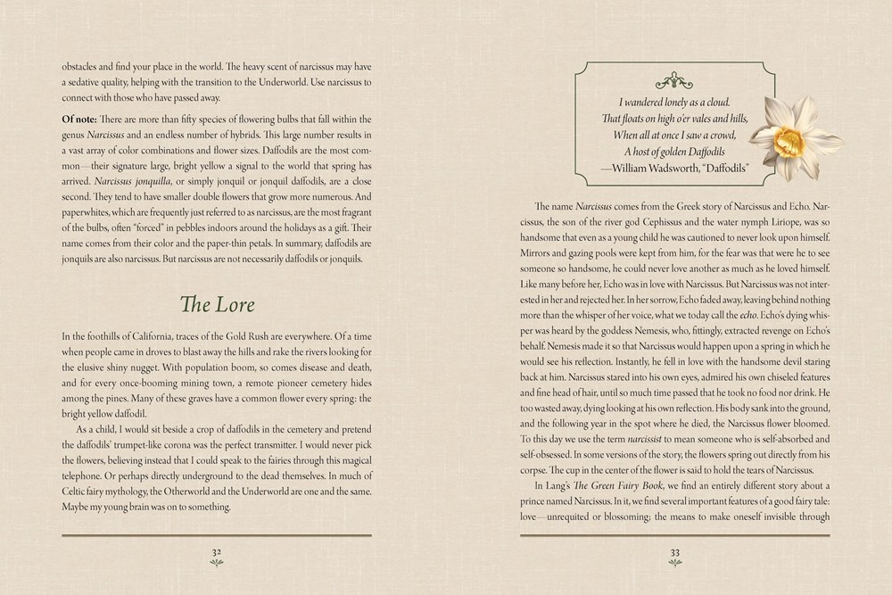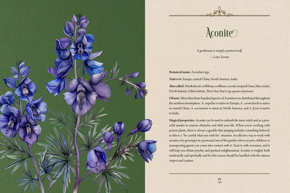Each chapter contains a cultivated selection of plants, arranged alphabetically by popular common name, with additional information including botanical name, common names, folklore, ethnobotanical properties, magical and occult properties, and modern usage if applicable.
