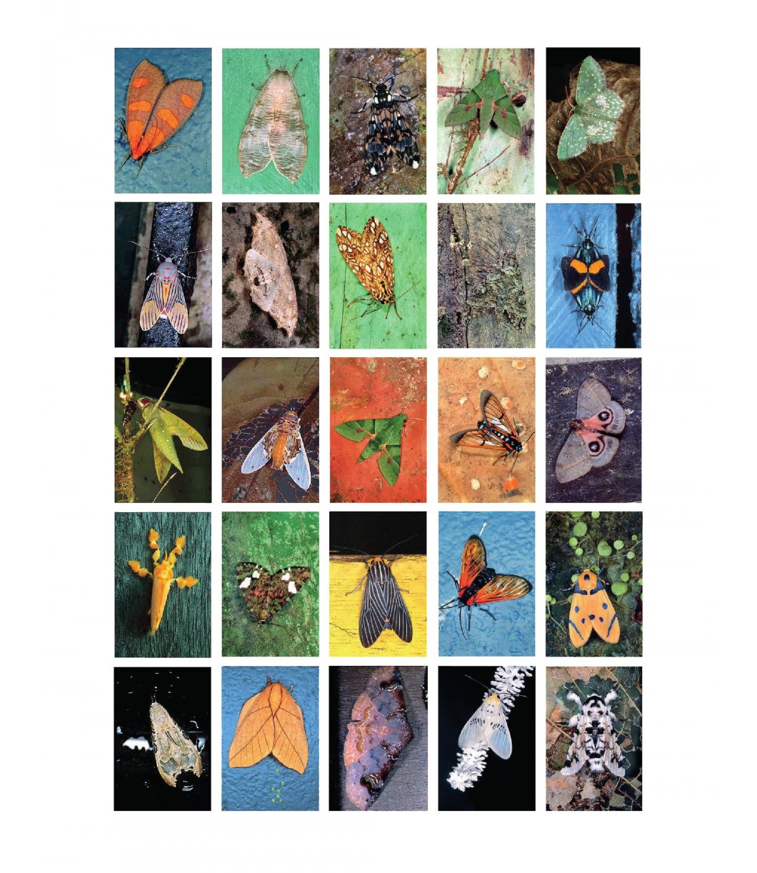 These stunning color portraits present the insects – many of which may never have been photographed as living specimens before, and some of which may not be seen again – arrayed in typologies of twenty-five per sheet. The moths are photographed alive, in natural positions and postures, and set against a variety of backgrounds taken from the natural world and images from art history.