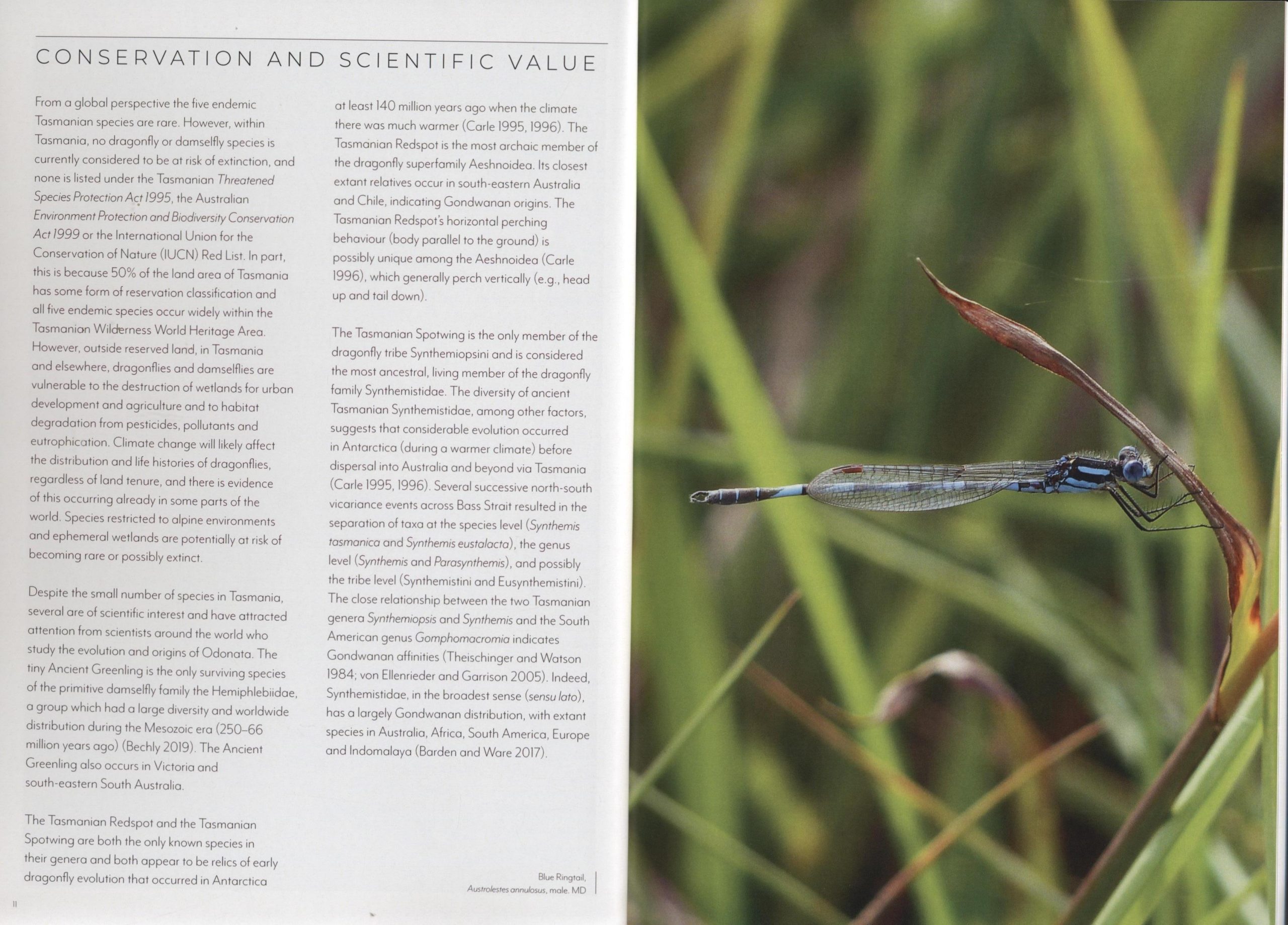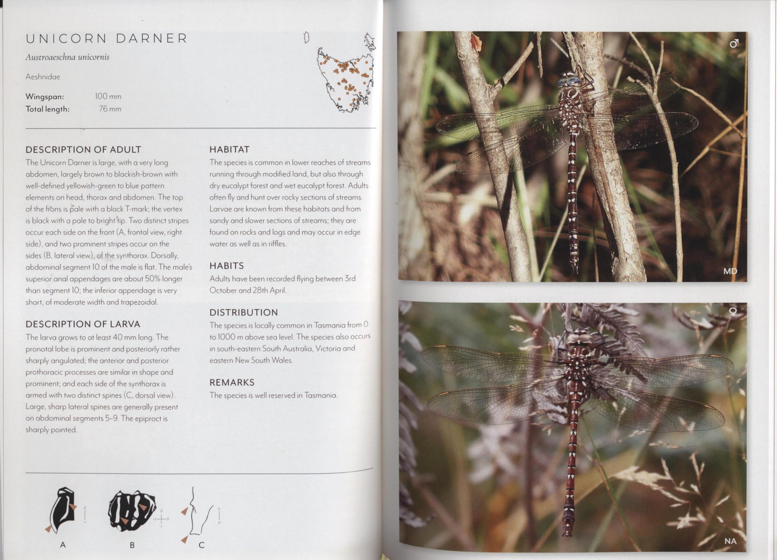 This field guide is dedicated solely to Tasmanian species of dragonflies and damselflies and includes information on their conservation and scientific significance. It also includes the most recent consensus of dragonfly and damselfly taxonomy. The beautiful images, detailed descriptions, identification keys and distribution maps will help the reader identify the dragonflies and damselflies in Tasmania. By taking an interest in this group of animals and reporting identifications we can help build our understanding of their distribution and ecology and help better conserve and manage Tasmania’s unique fauna.